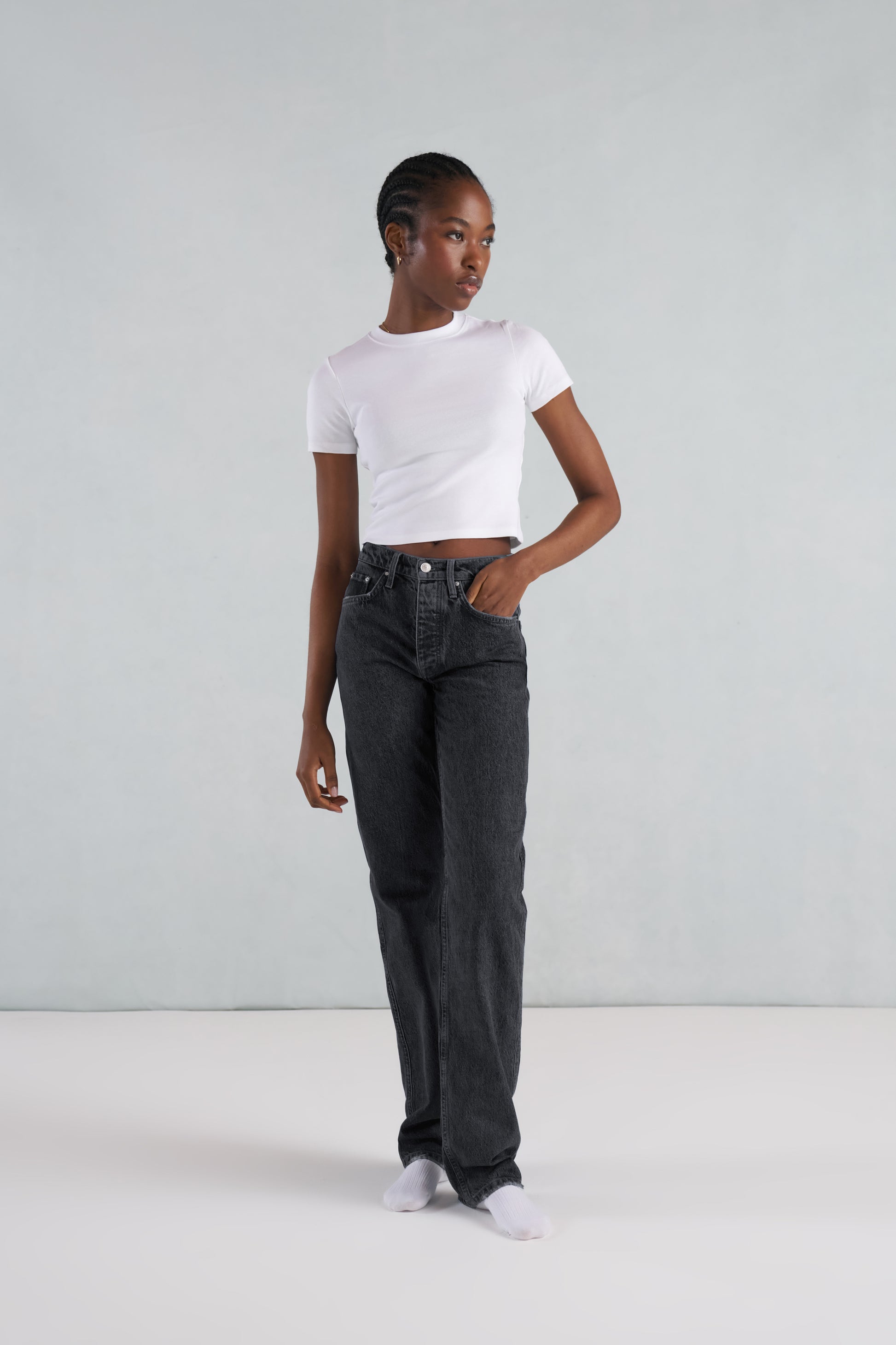A new wash in our best-selling straight leg, mid-rise denim. The leg is designed to hug around the waist and bum area comfortably whilst skimming past the thighs, then falling into an easy wide straight leg that tappers at the hem. This is a classic denim style in a powdered washed black. Style known as STRAIGHT.