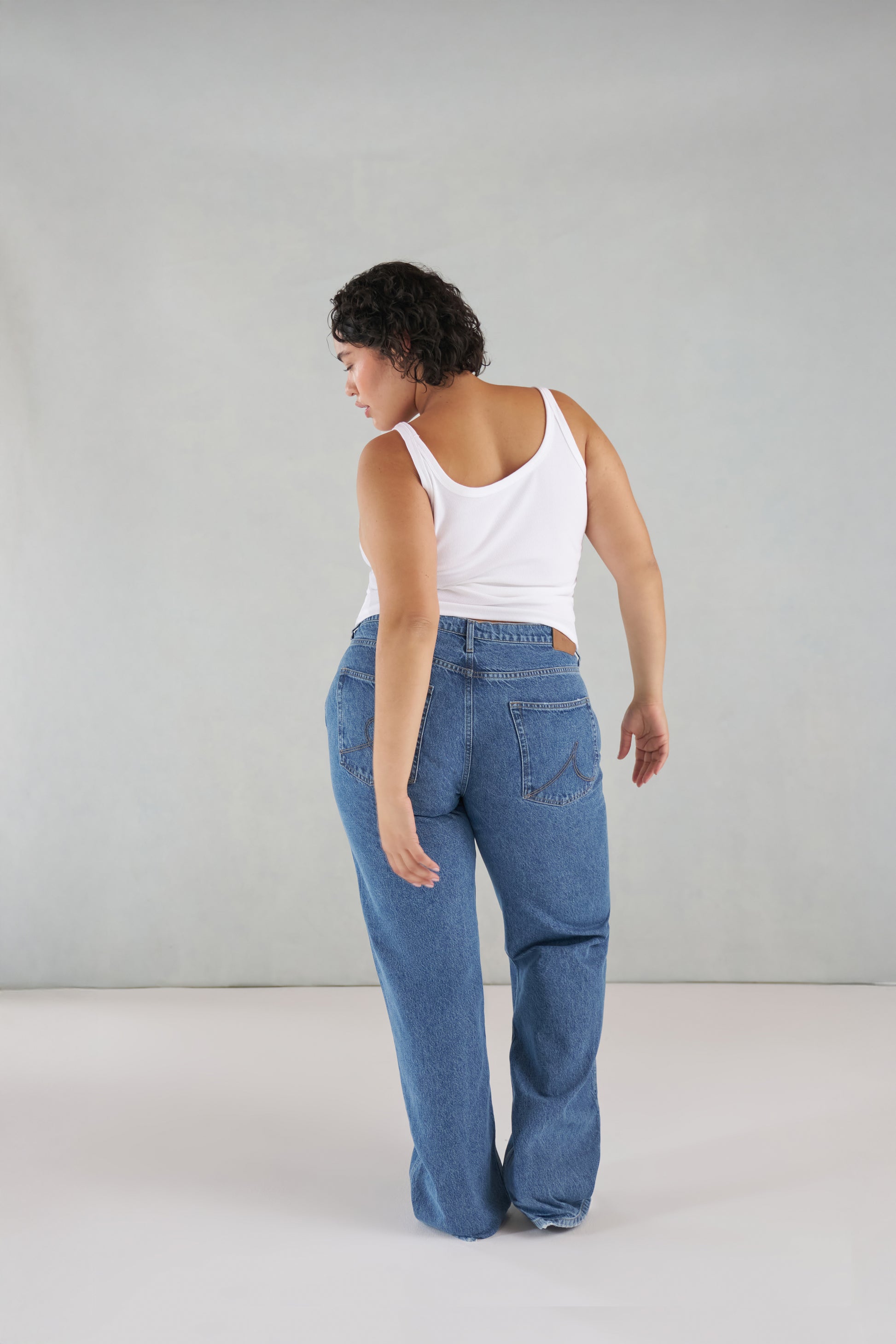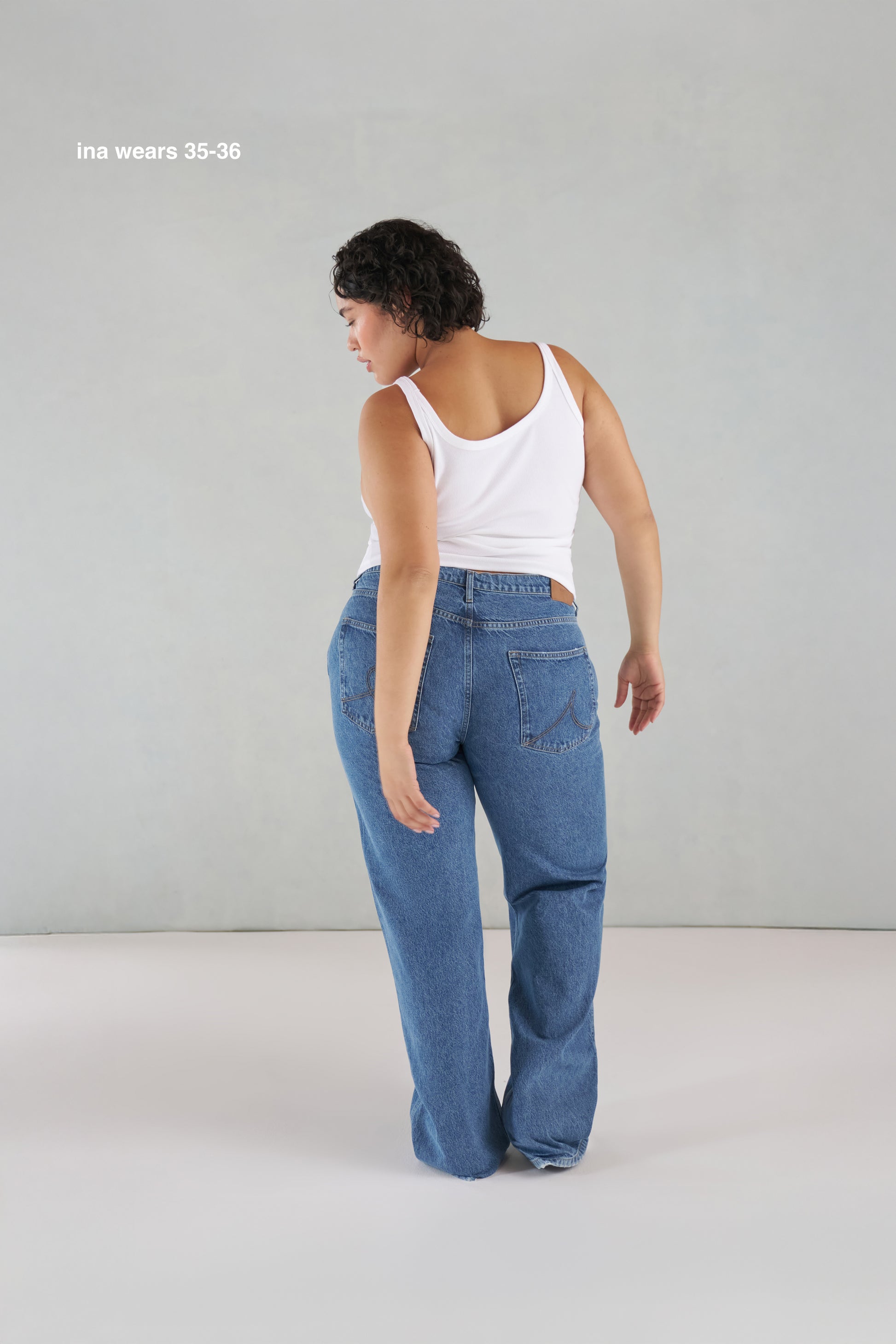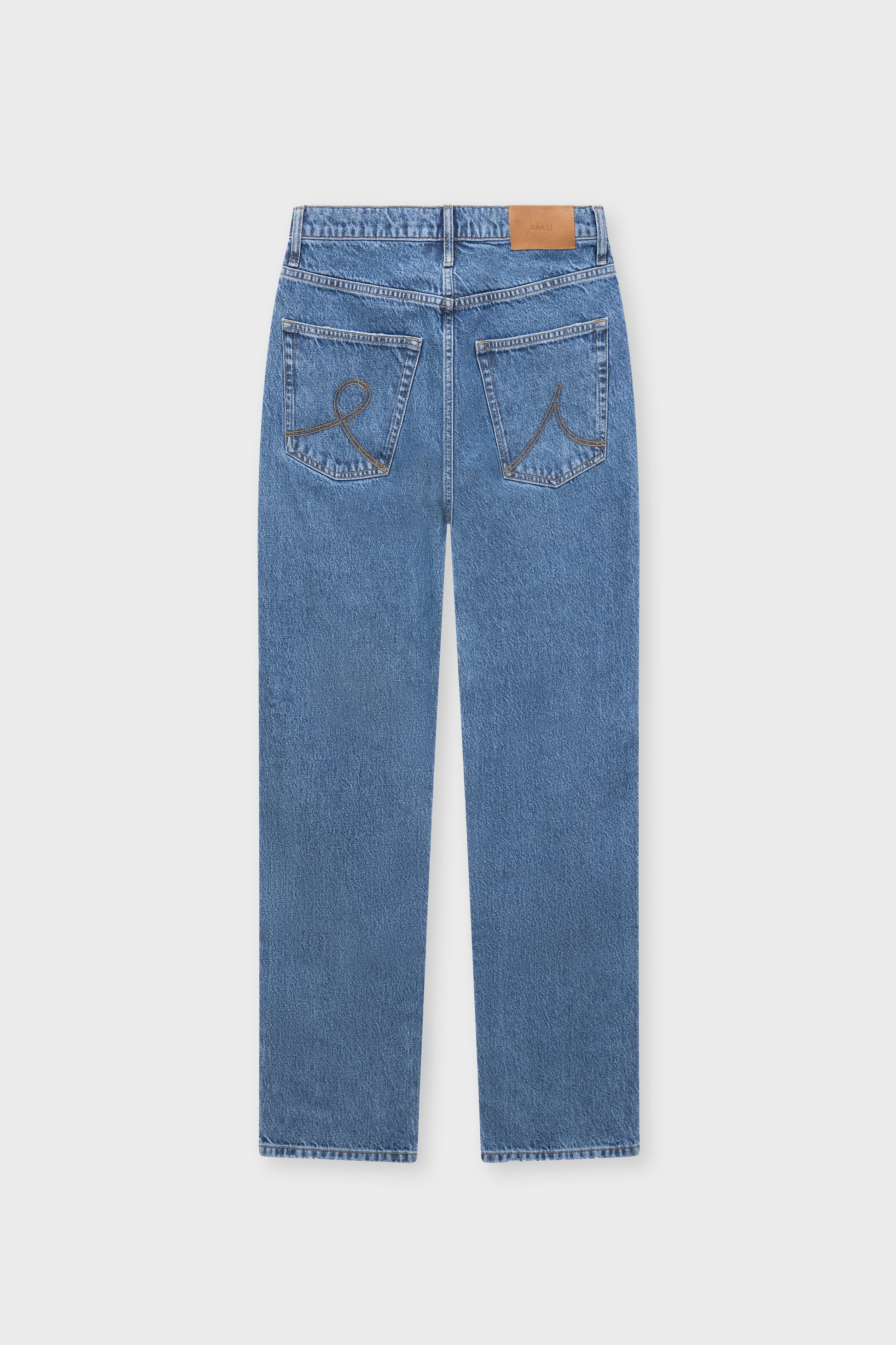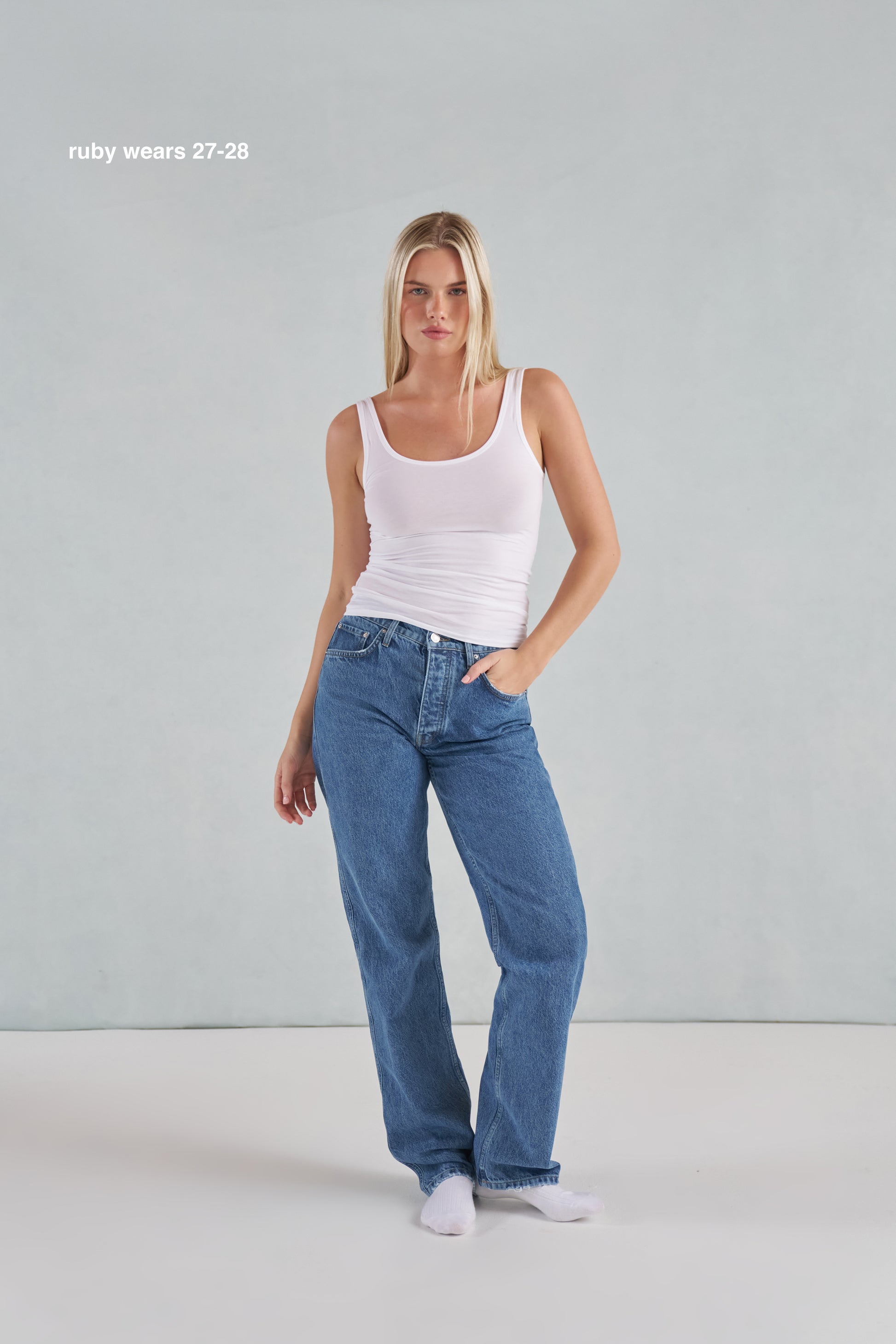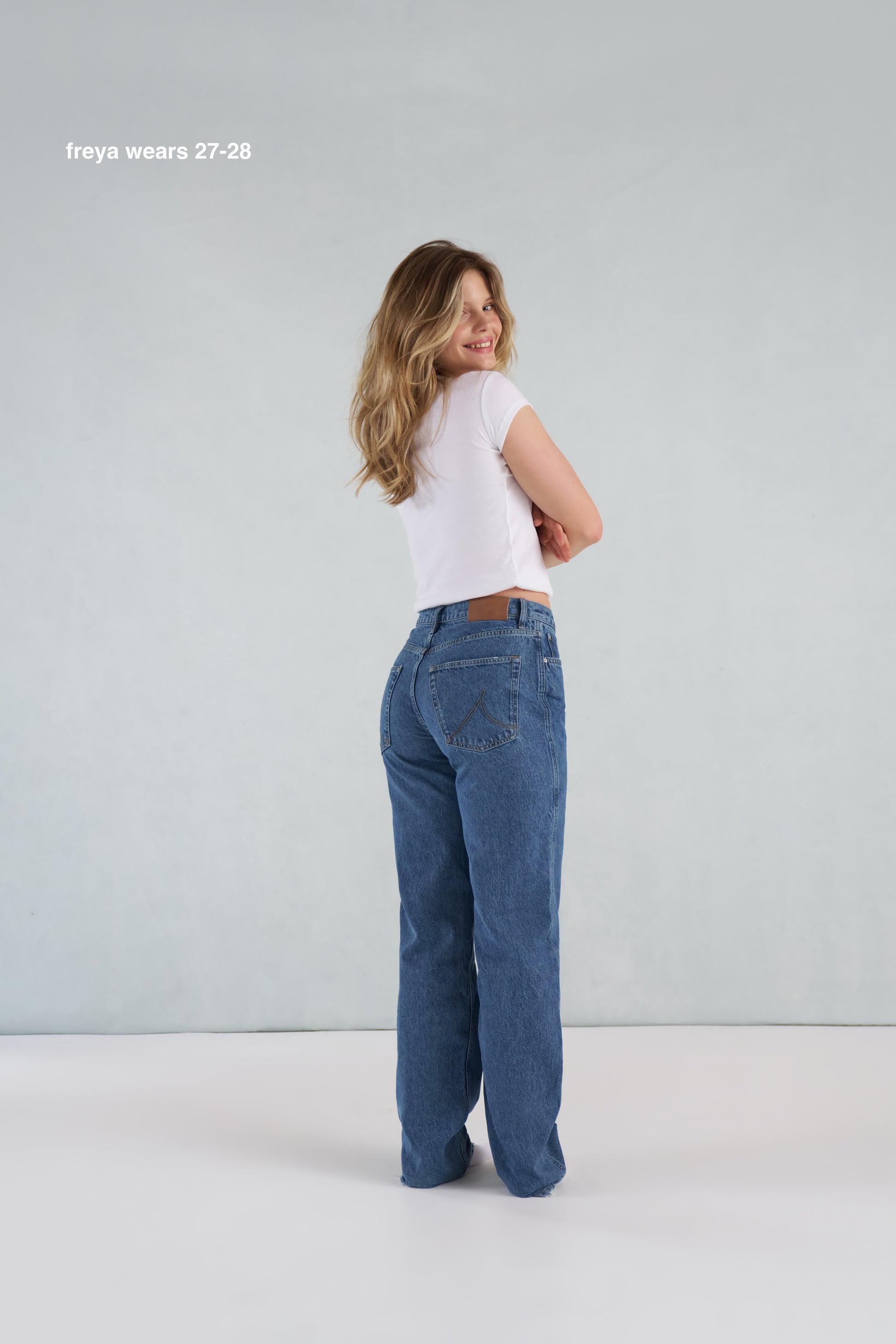 A straight leg, mid-rise denim. The leg is designed to hug around the waist and bum area comfortably whilst skimming past the thighs, then falling into an easy wide straight leg that tappers at the hem. This is a classic denim style with a classic, premium vintage blue wash.