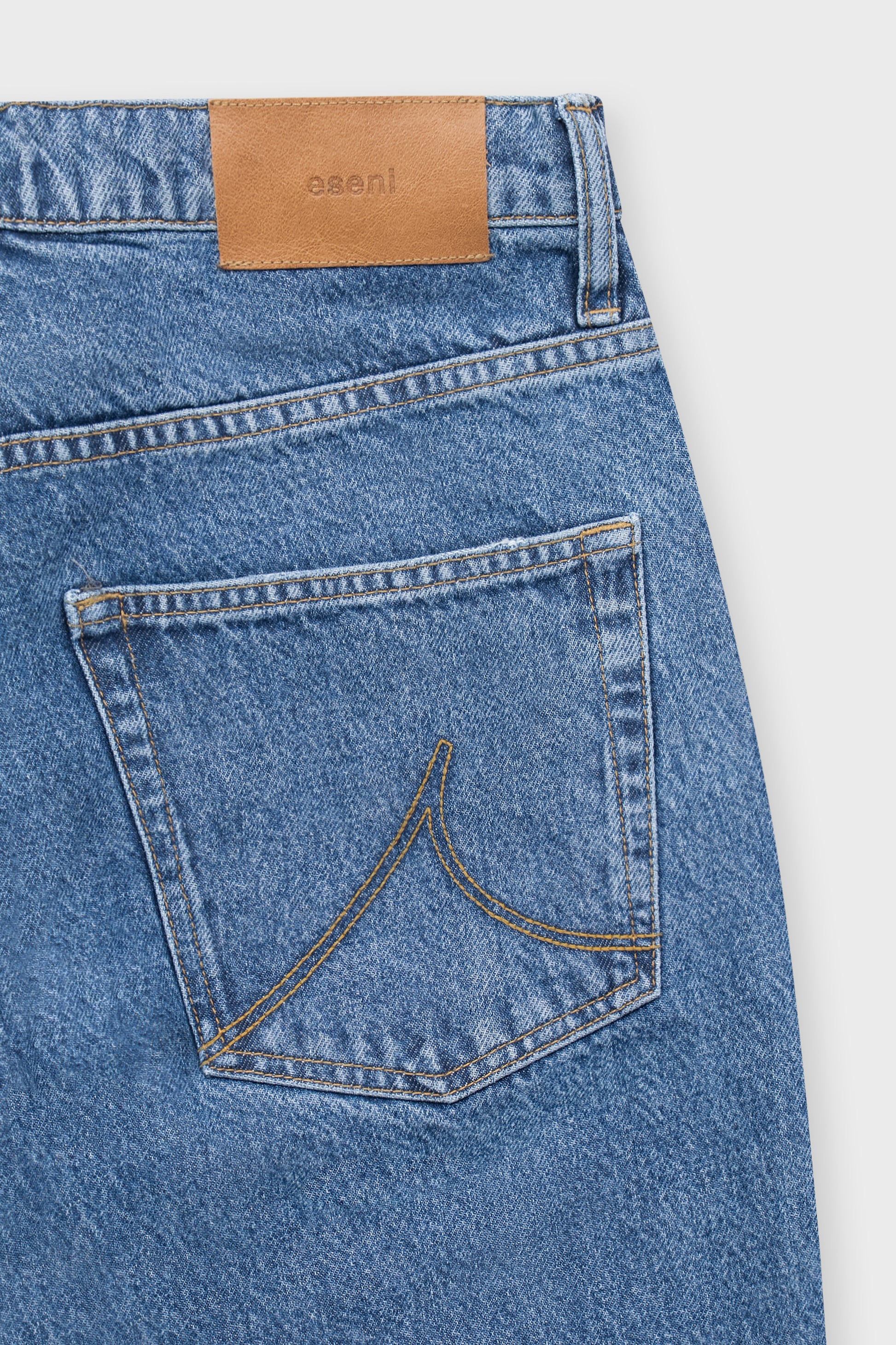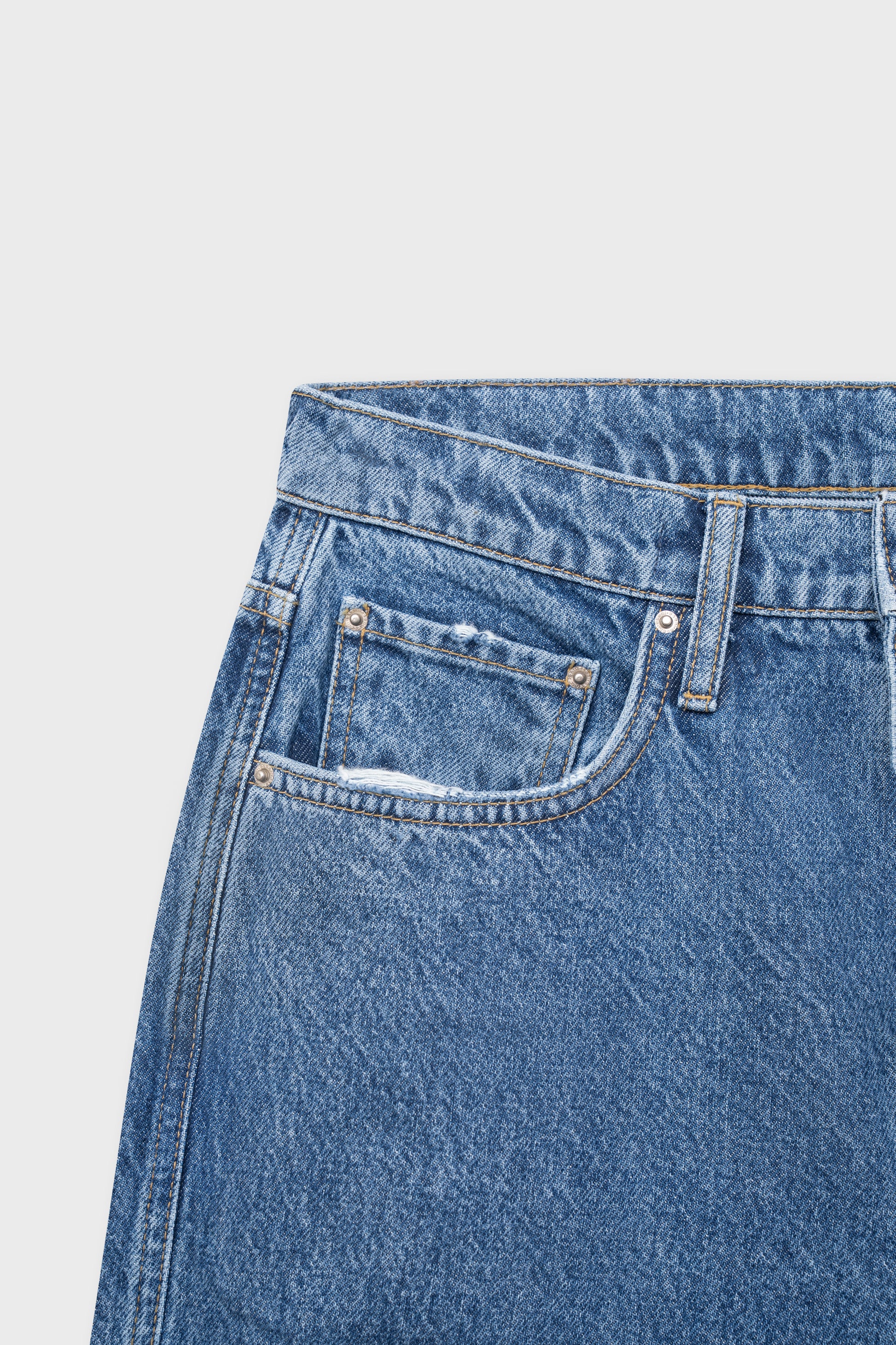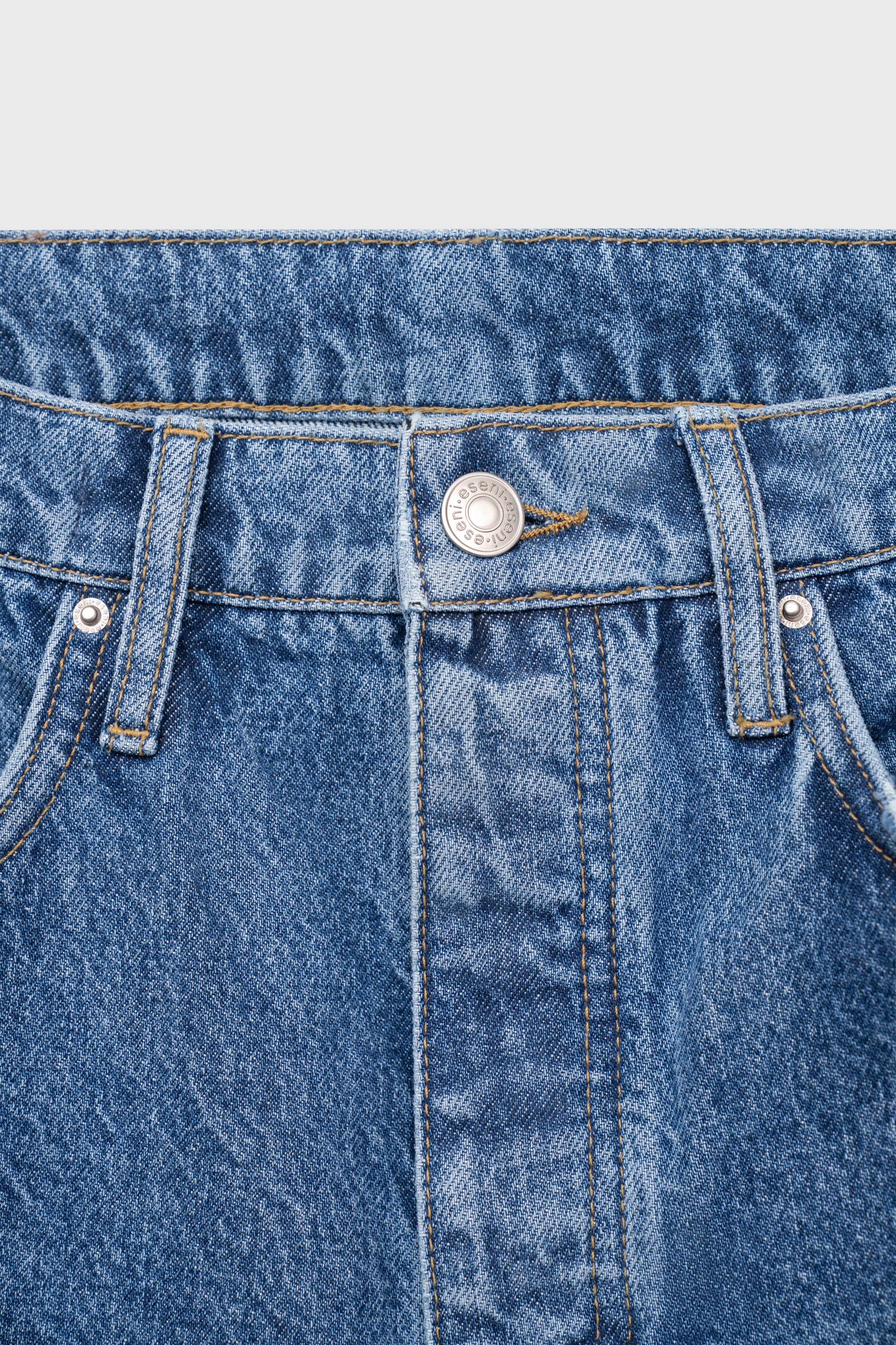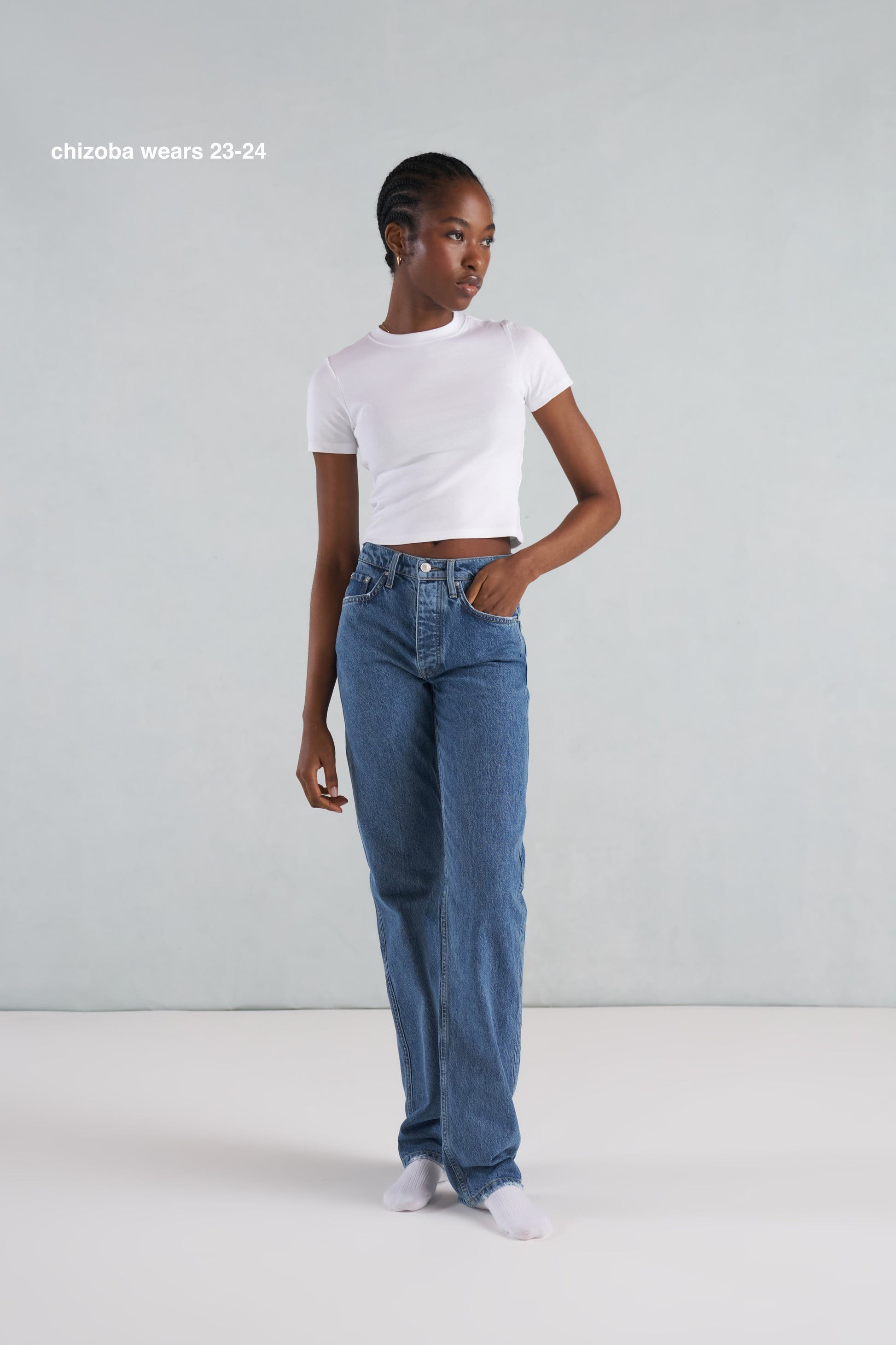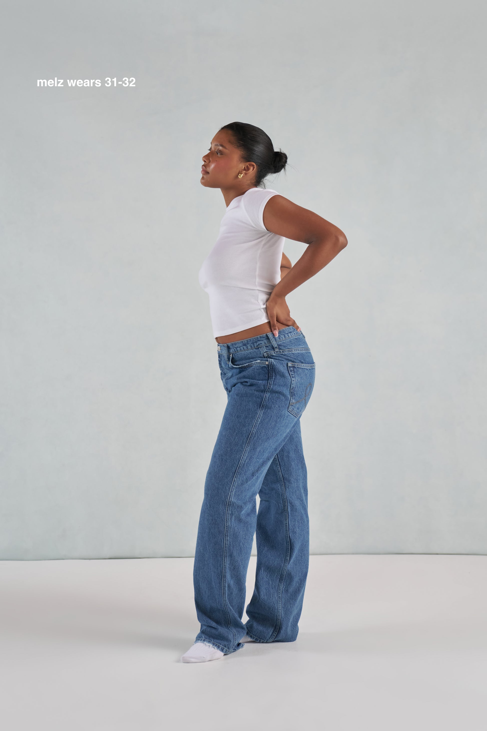 A straight leg, mid-rise denim. The leg is designed to hug around the waist and bum area comfortably whilst skimming past the thighs, then falling into an easy wide straight leg that tappers at the hem. This is a classic denim style with a classic, premium vintage blue wash.